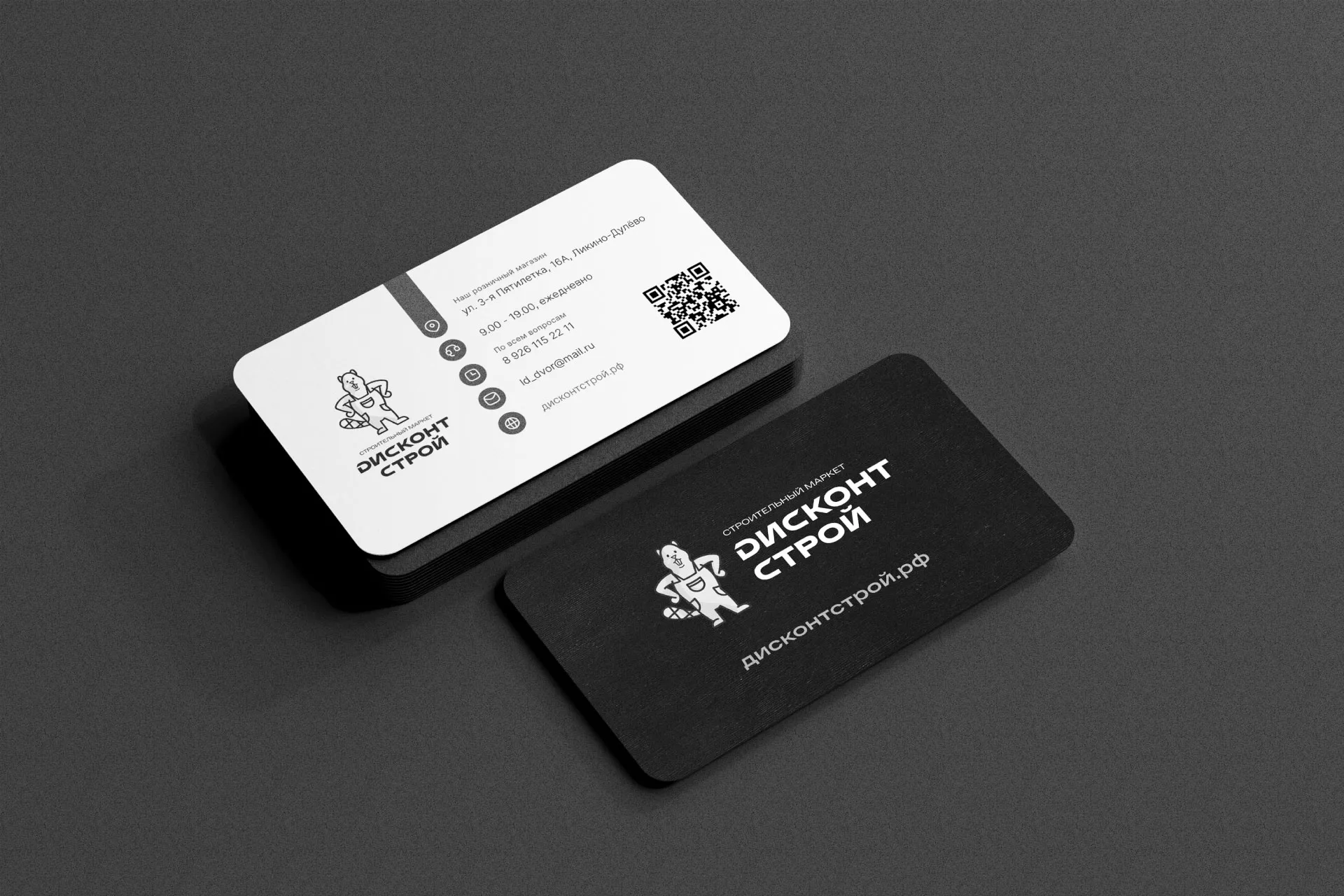 Вместе с логотипом, мы предложили заказчику сразу визуализацию логотипа в возможном дизайне на фирменный визитках магазина «Дисконт Строй» в Воротынске.
